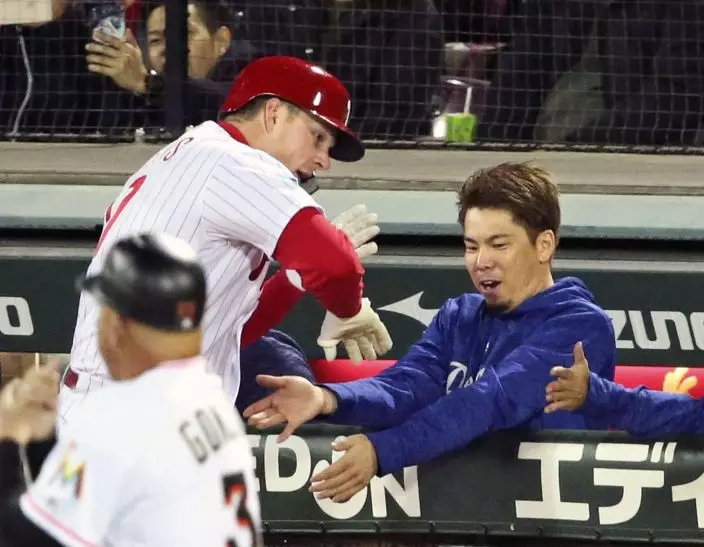 MLB All-Star designated hitter Rhys Hoskins of the Philadelphia Phillies celebrates with starter Kenta Maeda, right, of the Los Angeles Dodgers at bench after hitting a solo home-run off All Japan starter Daichi Osera in the second inning of Game 4 at their All-Stars Series baseball at Mazda Zoom-Zoom Stadium in Hiroshima, western Japan, Tuesday, Nov. 13, 2018. (Kyodo News via AP)