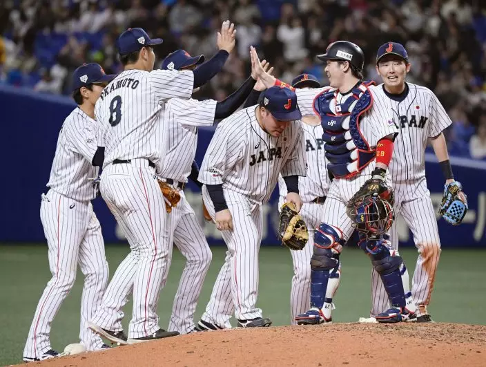 All Japan catcher Takuya Kai, second from right, celebrates with teammates after beating MLB All-Stars 6-5 in Game 5 at their All-Stars Series baseball at Nagoya Dome in Nagoya, central Japan, Wednesday, Nov. 14, 2018. (Kyodo News via AP)