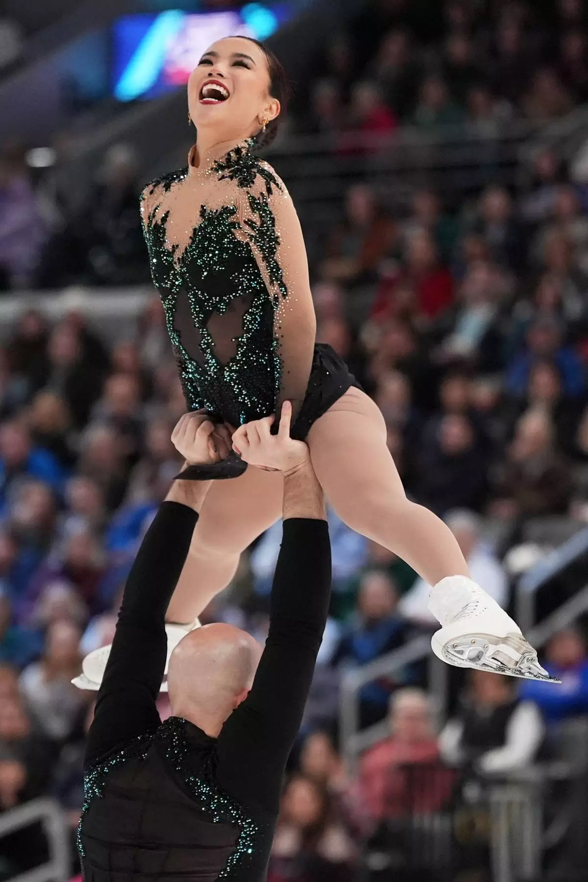 Misha Mitrofanov lifts his partner Alisa Efimova after they took first place to win the pairs free skating competition at the U.S. Figure Skating Championships, Friday, Jan. 9, 2026, in St. Louis. (AP Photo/Stephanie Scarbrough)