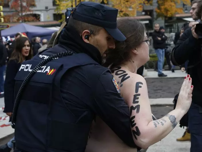 A member of feminist movement Femen is detained by Spanish police after a protest against a far-right rally in Madrid, Spain, Sunday, Nov. 18, 2018. Hundreds of people nostalgic for Spain's fascist past held a peaceful rally on Sunday to mark the 43rd anniversary of dictator Francisco Franco's death. (AP PhotoManu Fernandez)