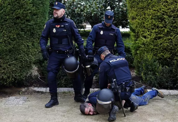A man is detained after protesting against a far-right rally in Madrid, Spain, Sunday, Nov. 18, 2018. Hundreds of people nostalgic for Spain's fascist past held a rally on Sunday to mark the 43rd anniversary of dictator Francisco Franco's death. (AP PhotoManu Fernandez)