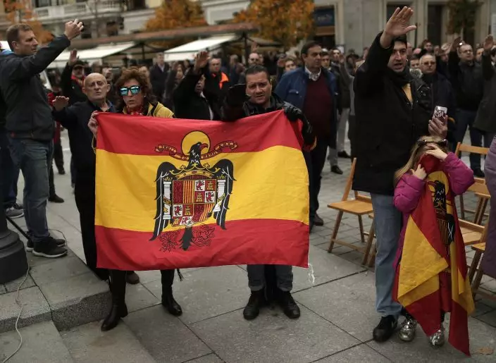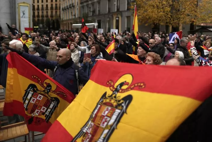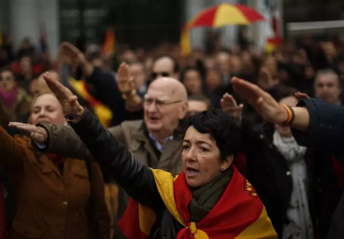Fascists and extreme far right wing supporters rise their right arm saluting the fascist anthem with Spanish pre-constitutional flags as they remember former Spanish Dictator Francisco Franco on the 43th anniversary of his death, in Madrid,Spain, Sunday, Nov. 18, 2018. Hundreds of people nostalgic for Spain's fascist past held a rally on Sunday to mark the 43th anniversary of dictator Francisco Franco's death. (AP PhotoManu Fernandez)