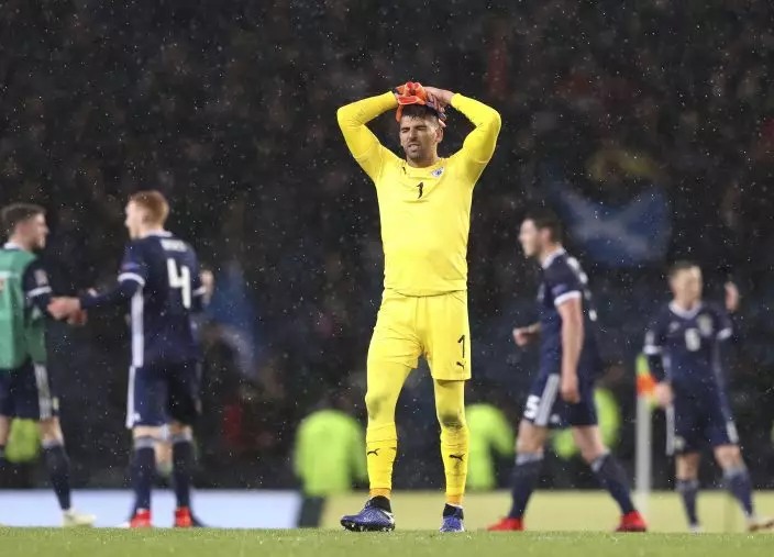 Israel's goalkeeper Ariel Harush reacts at the end of the UEFA Nations League soccer match between Scotland and Israel at Hampden Park, in Glasgow, Scotland, Tuesday, Nov. 20, 2018. (AP PhotoScott Heppell)