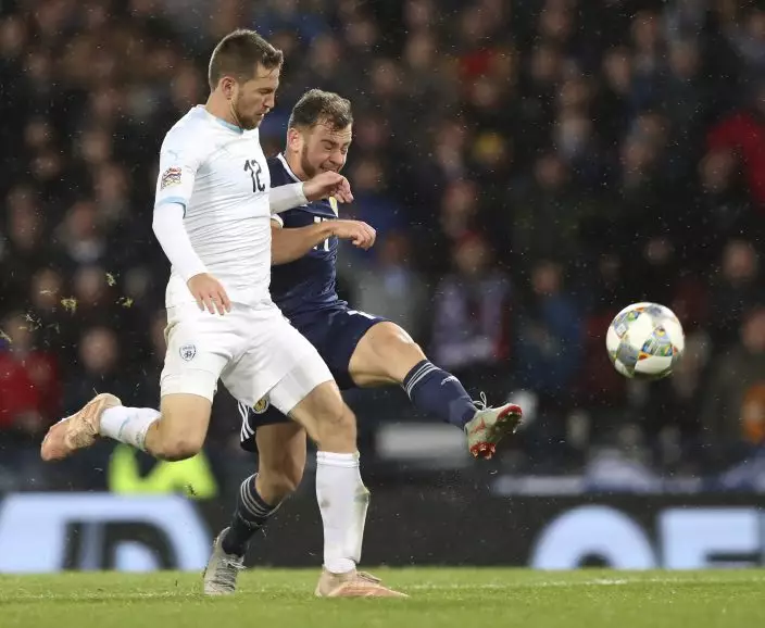 Israel's Sheran Yeini, left, and Scotland's Ryan Fraser challenge for the ball during the UEFA Nations League soccer match between Scotland and Israel at Hampden Park, in Glasgow, Scotland, Tuesday, Nov. 20, 2018. (AP PhotoScott Heppell)