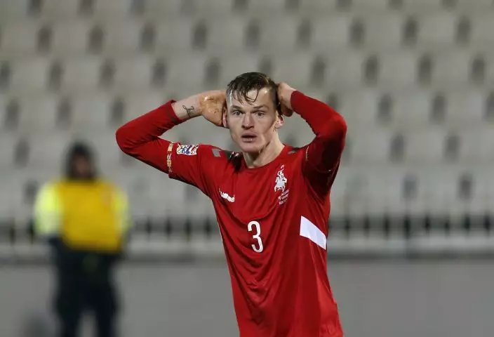 Lithuania's Justinas Janusevskis reacts during the UEFA Nations League soccer match between Serbia and Lithuania at Partizan stadium in Belgrade, Serbia, Tuesday Nov. 20, 2018. (AP PhotoDarko Vojinovic)
