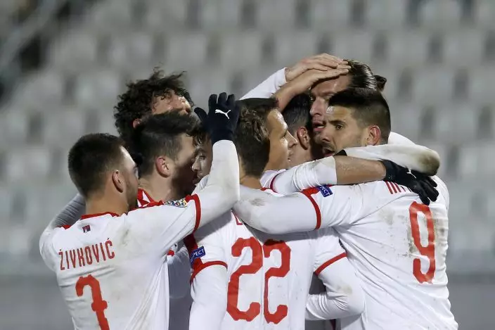 Serbia's Aleksandar Prijovic celebrates with teammates after scoring his side's third goal during the UEFA Nations League soccer match between Serbia and Lithuania at Partizan stadium in Belgrade, Serbia, Tuesday Nov. 20, 2018. (AP PhotoDarko Vojinovic)
