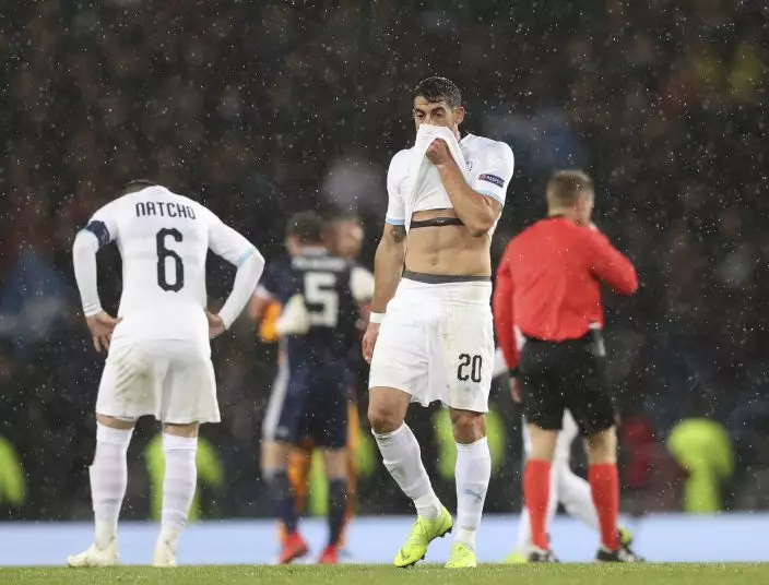 Israel's Omri Ben Harush reacts at the end of the UEFA Nations League soccer match between Scotland and Israel at Hampden Park, in Glasgow, Scotland, Tuesday, Nov. 20, 2018. (AP PhotoScott Heppell)