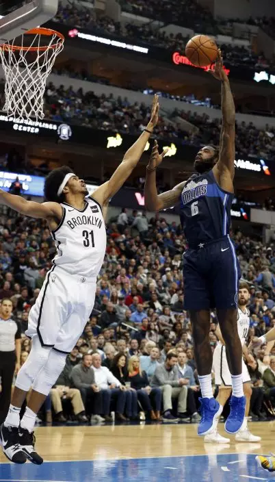 Dallas Mavericks center DeAndre Jordan (6) makes a shot in front of Brooklyn Nets center Jarrett Allen (31) during the first half of an NBA basketball game in Dallas, Wednesday, Nov. 21, 2018. (AP PhotoMichael Ainsworth)