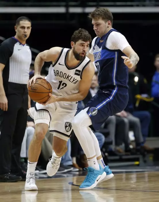 Brooklyn Nets forward Joe Harris (12) tries to get past Dallas Mavericks forward Luka Doncic (77) during the first half of an NBA basketball game in Dallas, Wednesday, Nov. 21, 2018. (AP PhotoMichael Ainsworth)