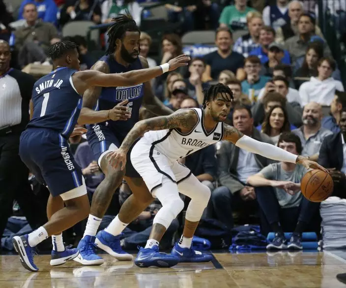 Dallas Mavericks guard Dennis Smith Jr. (1) and center DeAndre Jordan (6) defend Brooklyn Nets guard D'Angelo Russell (1) during the first half of an NBA basketball game in Dallas, Wednesday, Nov. 21, 2018. (AP PhotoMichael Ainsworth)