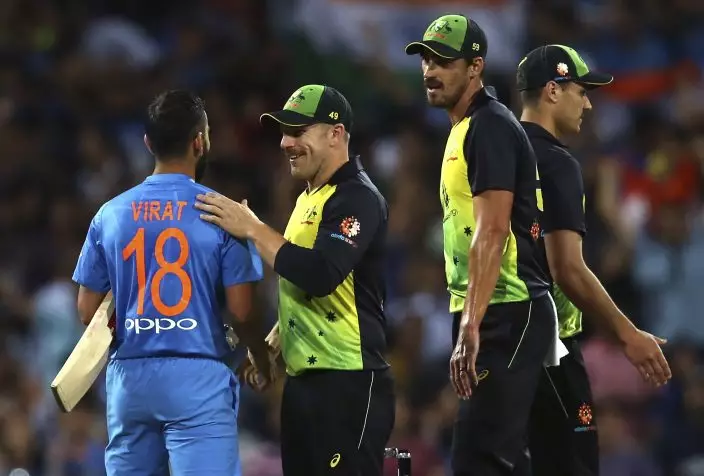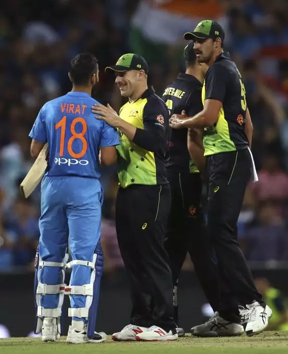 India's Virhat Kohli, left, is congratulated by Australia's captain Aaron Finch after winning their Twenty20 cricket match in Sydney, Sunday, Nov. 25, 2018. (AP PhotoRick Rycroft)