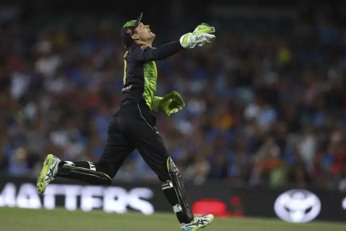 Australia's Alex Carey reacts after taking a catch to dismiss India's Rishabh Pant during their Twenty20 cricket match in Sydney, Sunday, Nov. 25, 2018. (AP PhotoRick Rycroft)