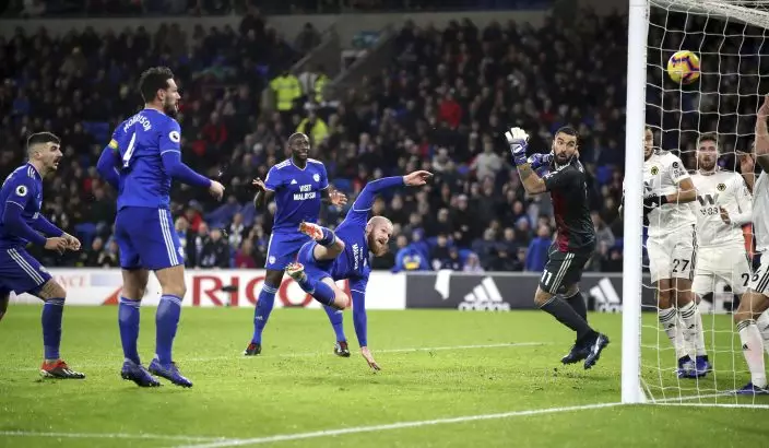 Cardiff City's Aron Gunnarsson, center, scores his side's first goal of the game during their Premier League soccer match against the Wolverhampton Wanderers at Cardiff City Stadium, Wales, Friday, Nov. 30, 2018. (Nick Potts PA via AP)