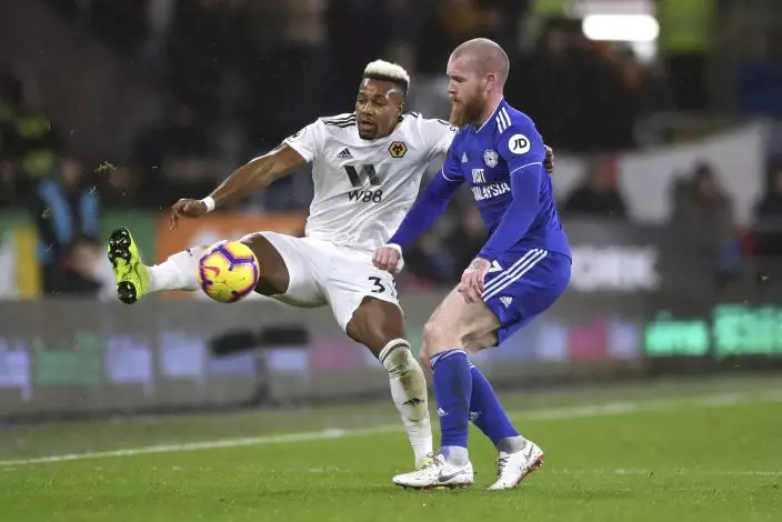 Wolverhampton Wanderers' Adama Traore, left, and Cardiff City's Aron Gunnarsson battle for the ball during their Premier League soccer match at Cardiff City Stadium, Wales, Friday, Nov. 30, 2018. (Nick Potts PA via AP)