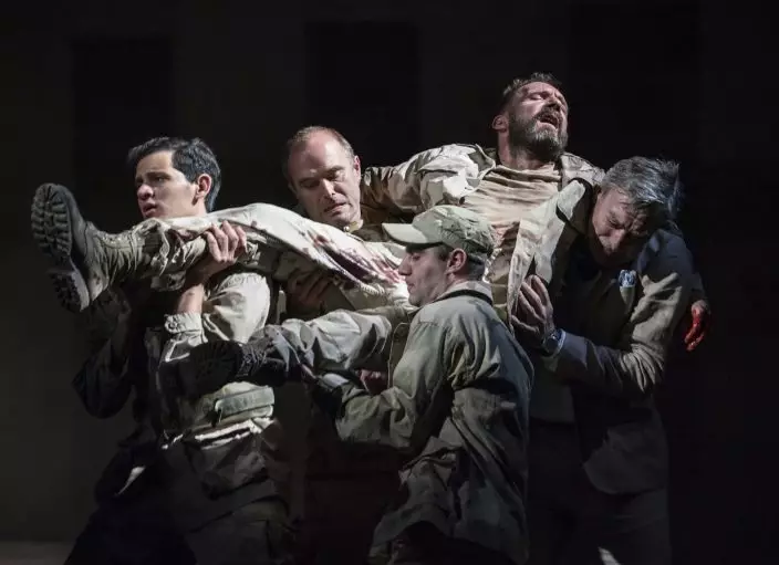 In this undated photo released by The National Theatre, a scene from the London National Theatre production of Antony & Cleopatra starring Ralph Finnes as he is carried by other actors. The tale of a tragic romance by William Shakespeare, directed by Simon Godwin, has two top-flight actors, Ralph Finnes and Sophie Okonedo starring as the lovers rocked by war and empire, and a live snake, no wonder it's a hit show. (Johan PerssonNational Theatre via AP)