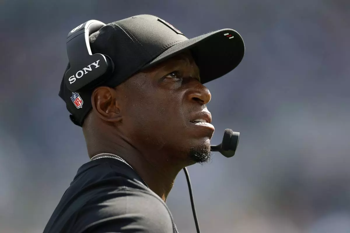 Atlanta Falcons head coach Raheem Morris watches during the second half of an NFL football game against the Carolina Panthers, Sunday, Sept. 21, 2025, in Charlotte, N.C. (AP Photo/Rusty Jones)