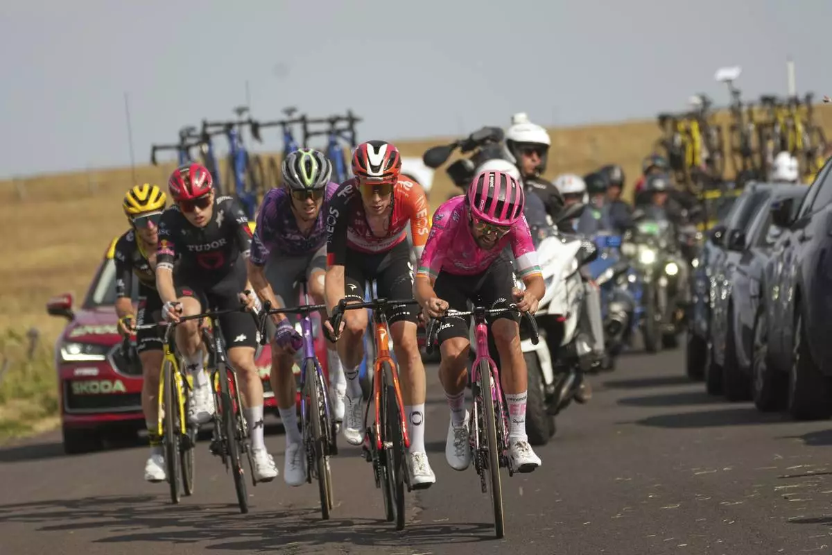 Ireland's Ben Healy leads the breakaway with Netherlands' Thymen Arensman, Australia's Ben O'Connor, Australia's Michael Storer, and Britain's Simon Yates, from right to left, during the tenth stage of the Tour de France cycling race over 165.3 kilometers (102.7 miles) with start in Ennezat and finish in Le Mont-Dore Puy de Sancy, France, Monday, July 14, 2025. (AP Photo/Thibault Camus)