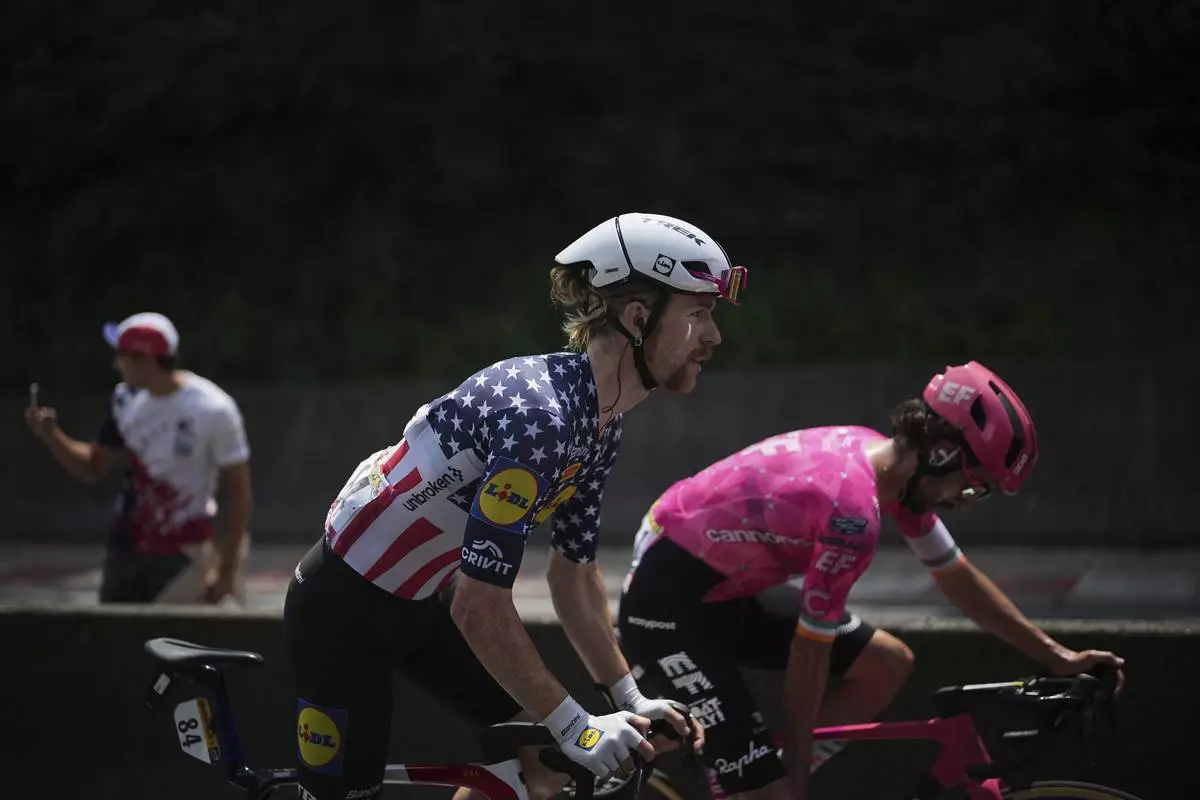 Quinn Simmons of the U.S., center, and Ireland's Ben Healy ride in the breakaway during the tenth stage of the Tour de France cycling race over 165.3 kilometers (102.7 miles) with start in Ennezat and finish in Le Mont-Dore Puy de Sancy, France, Monday, July 14, 2025. (AP Photo/Thibault Camus)