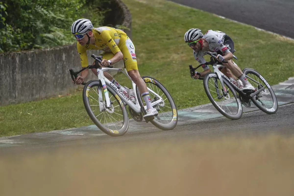 Slovenia's Tadej Pogacar, wearing the overall leader's yellow jersey, and teammate Britain's Adam Yates ride on the Charade Circuit during the tenth stage of the Tour de France cycling race over 165.3 kilometers (102.7 miles) with start in Ennezat and finish in Le Mont-Dore Puy de Sancy, France, Monday, July 14, 2025. (AP Photo/Thibault Camus)