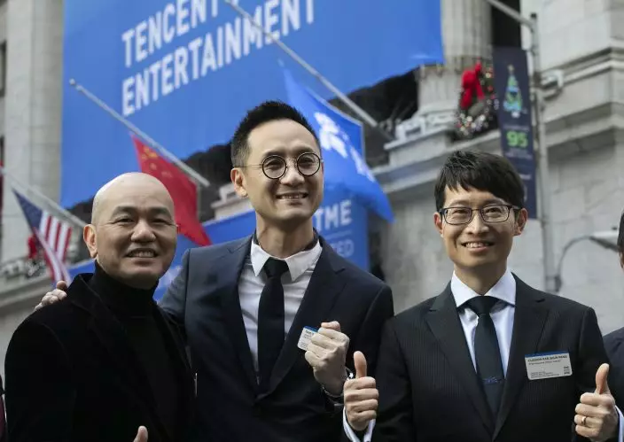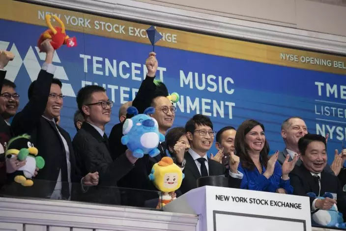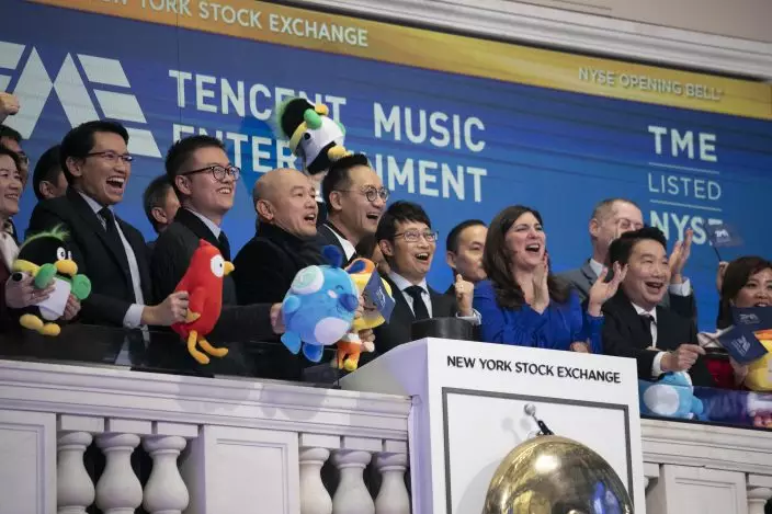Tencent Music Entertainment executives and guests attend the opening bell ceremony at the New York Stock Exchange for the Chinese company's IPO, Wednesday, Dec. 12, 2018. (AP PhotoMark Lennihan)