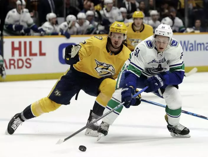 Nashville Predators center Ryan Johansen (92) and Vancouver Canucks defenseman Troy Stecher (51) chase after the puck in the second period of an NHL hockey game Thursday, Dec. 13, 2018, in Nashville, Tenn. (AP PhotoMark Humphrey)