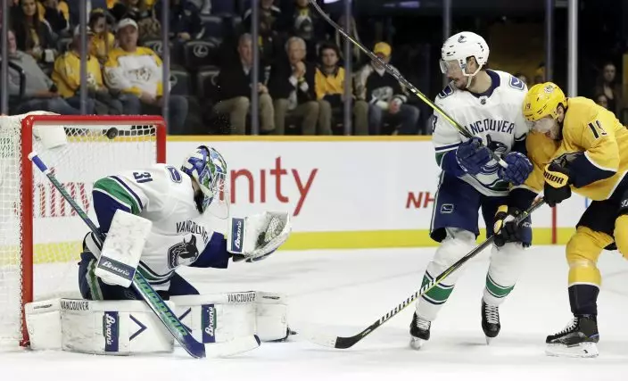 Nashville Predators center Calle Jarnkrok (19), of Sweden, deflects the puck past Vancouver Canucks goaltender Anders Nilsson (31), of Sweden, for a goal in the second period of an NHL hockey game Thursday, Dec. 13, 2018, in Nashville, Tenn. (AP PhotoMark Humphrey)