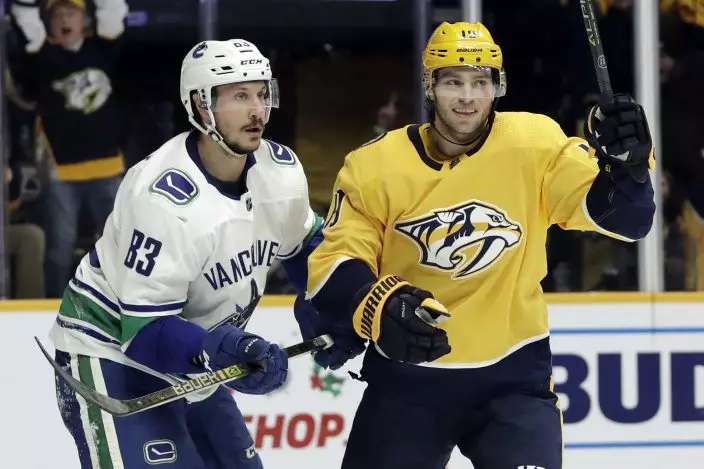 Nashville Predators center Calle Jarnkrok (19), of Sweden, celebrates after scoring a goal against the Vancouver Canucks in the second period of an NHL hockey game Thursday, Dec. 13, 2018, in Nashville, Tenn. At left is Canucks center Jay Beagle (83). (AP PhotoMark Humphrey)