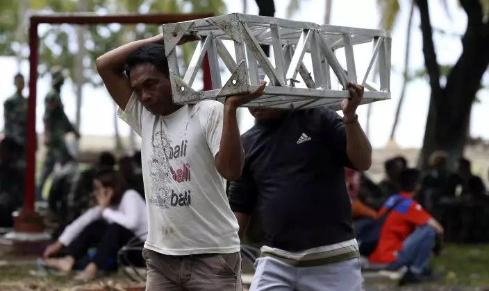 Tsunami survivor Mamat Setiadi carries part of a stage at Tanjung Lesung beach resorts Indonesia, Monday, Dec. 24, 2018. The tsunami that roared ashore in Indonesia from the Sunda Strait, killing more than 280 people and injuring over 1,000, was particularly cruel. It hit on a busy holiday weekend when many people were enjoying the warm night breeze on the beach under a full moon. And unlike most big waves, typically alerted by an earthquake's violent shaking, this was a stealth attack. (AP PhotoAchmad Ibrahim)