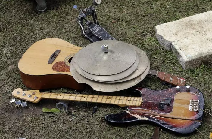 Nearby, only a skeleton of the band's stage remained beside a heap of twisted metal, overturned chairs and splintered sticks of wood. Soggy white tablecloths covered in dirt were strewn across the lawn. Grass and sod were jammed up against a keyboard resting beside broken speakers on the ground.