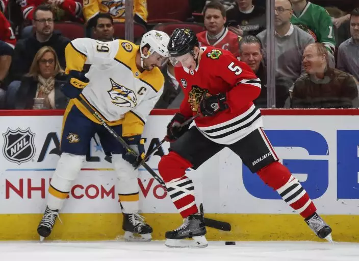 Chicago Blackhawks defenseman Connor Murphy (5) battles for the puck with Nashville Predators defenseman Roman Josi (59) during the first period of an NHL hockey game Wednesday, Jan. 9, 2019, in Chicago. (AP PhotoKamil Krzaczynski)