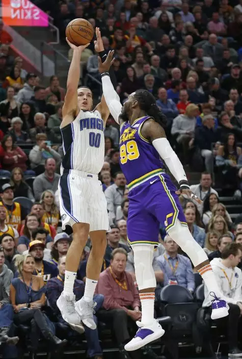 Orlando Magic forward Aaron Gordon (00) shoots as Utah Jazz forward Jae Crowder (99) defends during the first half of an NBA basketball game Wednesday, Jan. 9, 2019, in Salt Lake City. (AP PhotoRick Bowmer)