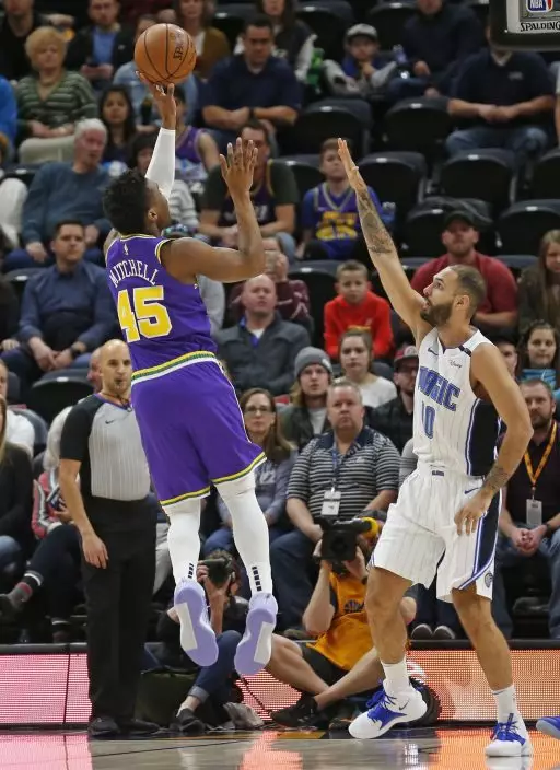 Utah Jazz guard Donovan Mitchell (45) shoots as Orlando Magic guard Terrence Ross (31) defends during the first half of an NBA basketball game Wednesday, Jan. 9, 2019, in Salt Lake City. (AP PhotoRick Bowmer)