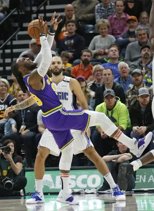 Utah Jazz forward Jae Crowder (99) loses the ball on a shot as Orlando Magic guard Evan Fournier watches during the first half of an NBA basketball game Wednesday, Jan. 9, 2019, in Salt Lake City. (AP PhotoRick Bowmer)