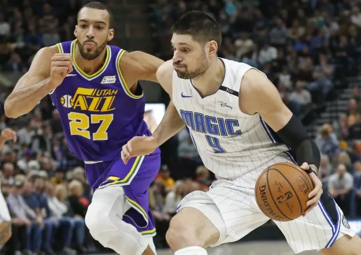 Orlando Magic center Nikola Vucevic (9) drives around Utah Jazz center Rudy Gobert (27) during the first half of an NBA basketball game Wednesday, Jan. 9, 2019, in Salt Lake City. (AP PhotoRick Bowmer)
