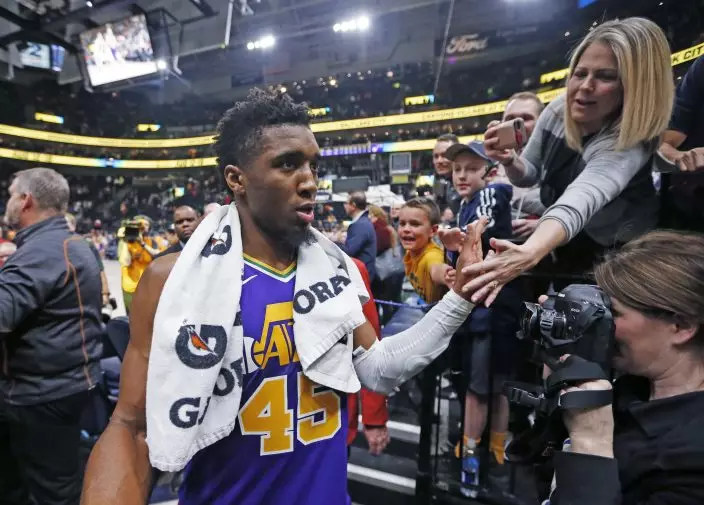 A fan reaches for Utah Jazz guard Donovan Mitchell (45) as he walks off the court following the team's NBA basketball game against the Orlando Magic on Wednesday, Jan. 9, 2019, in Salt Lake City. (AP PhotoRick Bowmer)