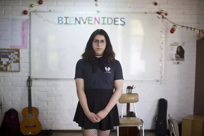 In this Dec.14, 2018 photo, Angela, a transgender girl, poses for a photo at the Amaranta Gomez school in Santiago, Chile. Students at the school are assigned to one of two classrooms based on age. (AP PhotoEsteban Felix)