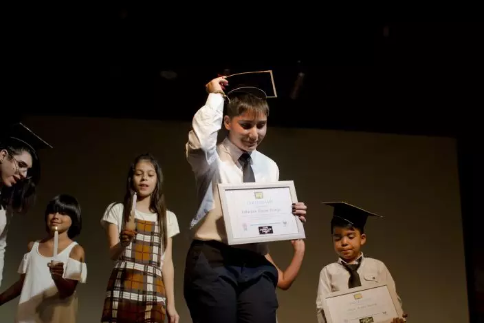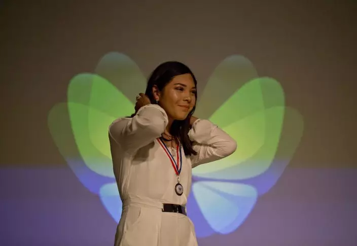 In this Dec.18, 2018 photo, Angela, a transgender girl, is given a "Best Effort" medal during the Amaranta Gomez school graduation ceremony, in Santiago, Chile. Despite the lack of resources, the foundation has started a summer school that offers dance and other workshops for about 20 children, including some who are not attending the school. (AP PhotoEsteban Felix)
