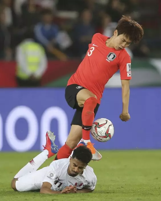 South Korea's defender Kim Jin-Su, top, fights for the ball with Qatar's forward Akram Afif, on the ground, during the AFC Asian Cup quarterfinal soccer match between Korea Republic and Qatar at the Zayed Sport City Stadium in Abu Dhabi, United Arab Emirates, Friday, Jan. 25, 2019. (AP PhotoKamran Jebreili)