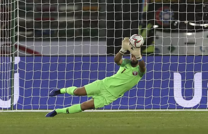 Qatar's goalkeeper Saad Al Sheeb, saves the ball during the AFC Asian Cup quarterfinal soccer match between Korea Republic and Qatar at the Zayed Sport City Stadium in Abu Dhabi, United Arab Emirates, Friday, Jan. 25, 2019. (AP PhotoKamran Jebreili)
