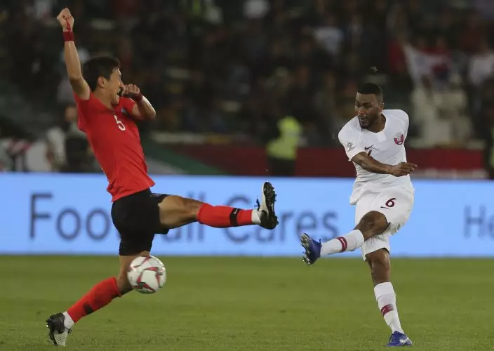 Qatar's midfielder Abdelaziz Hatem, right, kicks the ball in front of South Korea's midfielder Jung Woo-Young, left, as he scores his goal during the AFC Asian Cup quarterfinal soccer match between Korea Republic and Qatar at the Zayed Sport City Stadium in Abu Dhabi, United Arab Emirates, Friday, Jan. 25, 2019. (AP PhotoKamran Jebreili)