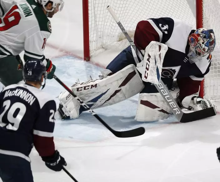 Colorado Avalanche goaltender Philipp Grubauer, right, stops a shot by Minnesota Wild center Luke Kunin, top left, as Colorado center Nathan MacKinnon defends in the third period of an NHL hockey game, Wednesday, Jan. 23, 2019, in Denver. The Wild won 5-2. (AP PhotoDavid Zalubowski)