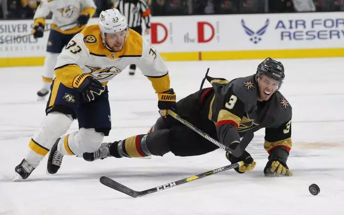 Nashville Predators right wing Viktor Arvidsson, left, and Vegas Golden Knights defenseman Brayden McNabb vie for the puck during the third period of an NHL hockey game Wednesday, Jan. 23, 2019, in Las Vegas. (AP PhotoJohn Locher)