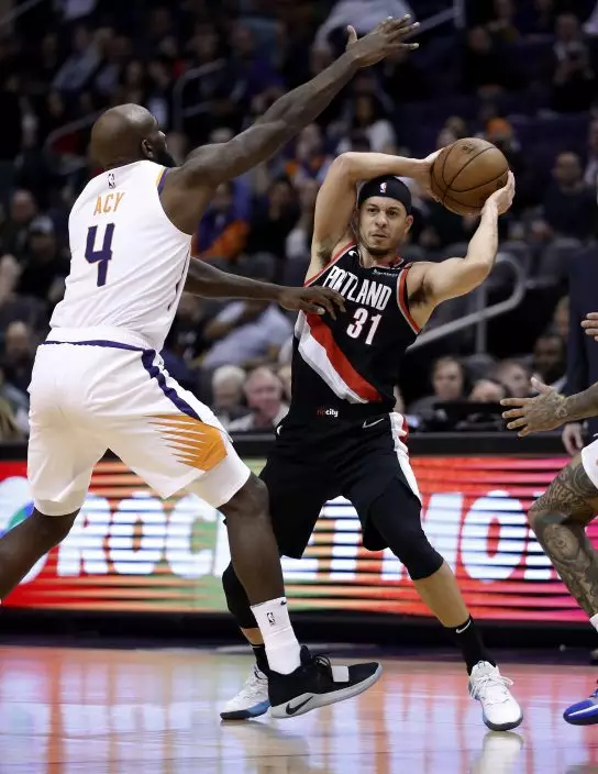 Portland Trail Blazers guard Seth Curry (31) looks to pass the ball as Phoenix Suns forward Quincy Acy (4) defends during the second half of an NBA basketball game Thursday, Jan. 24, 2019, in Phoenix. (AP PhotoMatt York)