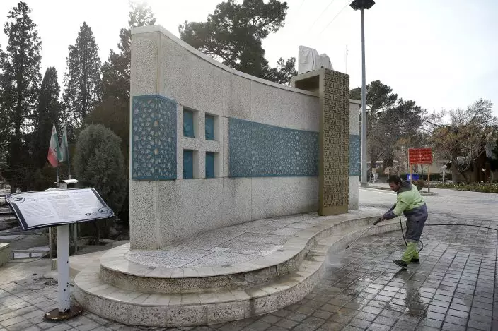 In this Saturday, Jan. 19, 2019 photo, a worker cleans a monument at the place Ayatollah Khomeini gave a speech on his return from 15 years of exile, at Behest-e-Zahra cemetery just outside Tehran, Iran. Ayatollah Khomeini was face of Iran’s revolution, but now his family is largely out of the country’s politics. Khomeini and his wife, Khadijeh Saghafi, had five children and 15 grandchildren. (AP PhotoEbrahim Noroozi)