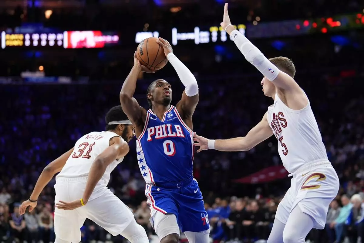 Philadelphia 76ers' Tyrese Maxey (0) goes up for a shot against Cleveland Cavaliers' Sam Merrill (5) during the first half of an NBA basketball game Wednesday, Jan. 14, 2026, in Philadelphia. (AP Photo/Matt Slocum)