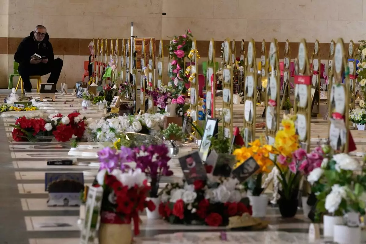 A man prays over the graves of Hezbollah fighters killed, at Al-Hawraa Zaynab Cemetery during Eid al-Fitr in Dahiyeh, Beirut's southern suburbs, Lebanon, Friday, March 20, 2026. (AP Photo/Hassan Ammar)