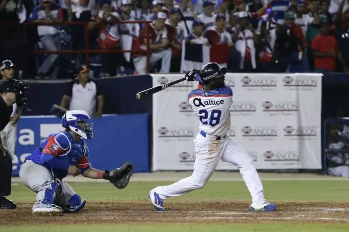 Junior Lake of the Dominican Republic's Estrellas Orientales bats a home run to win against of Puerto Rico's, Cangrejeros de Santurce during the ninth inning on their Caribbean Series baseball tournament match at Rod Carew stadium in Panama City, Thursday, Feb. 7, 2019. (AP PhotoArnulfo Franco)