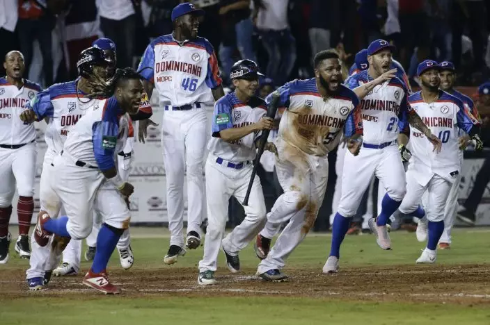 Players of the Dominican Republic's Estrellas Orientales celebrate after defeating Puerto Rico's Cangrejeros de Santurce on thei Caribbean Series baseball tournament match at Rod Carew stadium in Panama City, Thursday, Feb. 7, 2019. (AP PhotoArnulfo Franco)