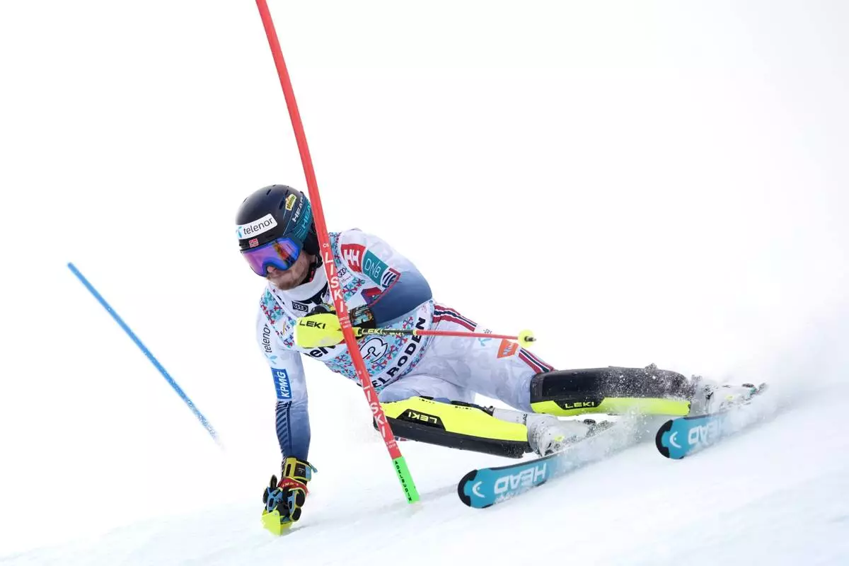 Norway's Henrik Kristoffersen speeds down the course during an alpine ski, men's World Cup slalom, in Adelboden, Switzerland, Sunday, Jan. 11, 2026. (AP Photo/Gabriele Facciotti)