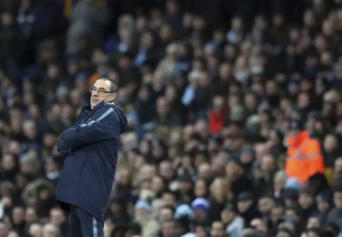 Chelsea manager Maurizio Sarri reacts during the English Premier League soccer match between Manchester City and Chelsea at Etihad stadium in Manchester, England, Sunday, Feb. 10, 2019. (AP PhotoJon Super)